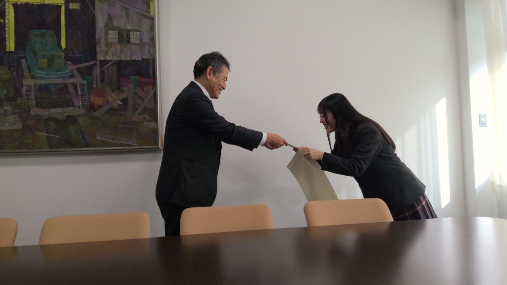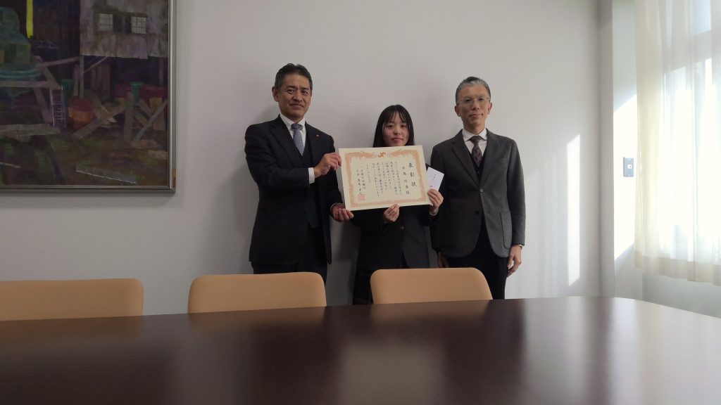 お知らせ/学校生活 市内専門高等学校等優秀生徒表彰 2026年2月20日 令和8年2月10日(火)校長室にて市内専門高等学校等優秀生徒表彰式が執り行われました。 総合ビジネス科3年生の生徒が、一宮商工会議所 専務理事の判治忠明様から、表彰状と記念品を授与していただきました。 授与後、彼女を囲んで判治様、校長等が歓談のひと時を持ちました。朗らかで物怖じしない彼女は、将来が楽しみな本校自慢の生徒です。