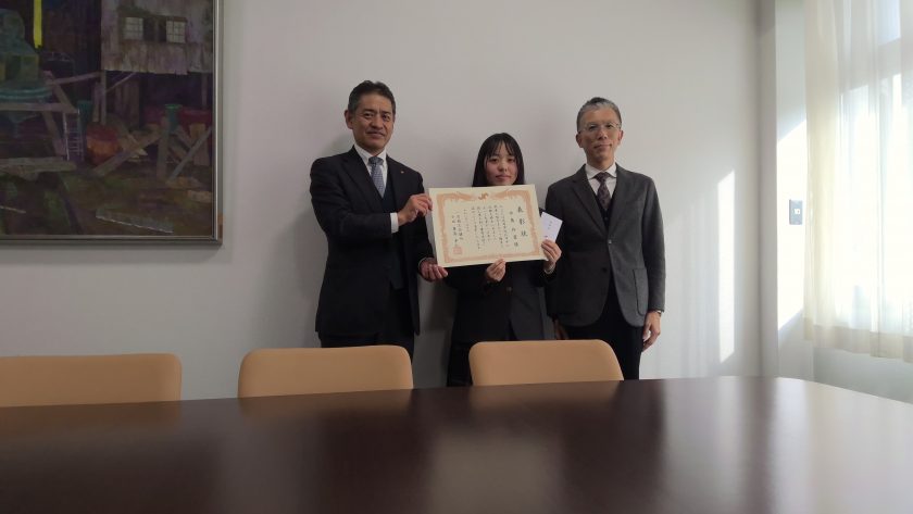 令和8年2月10日(火)校長室にて市内専門高等学校等優秀生徒表彰式が執り行われました。 総合ビジネス科3年生の生徒が、一宮商工会議所 専務理事の判治忠明様から、表彰状と記念品を授与していた